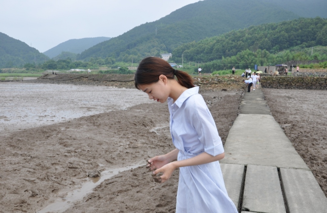 一晚上的休息之后,第二天上午我们一起去看了花墙村临海的滩涂,但因为时间不是很早,滩涂上已经退潮露出了泥地。滩涂泥地上有各种小鱼小虾螃蟹,大家都不在意满地的污泥很有兴趣的进行了捕捞玩耍。