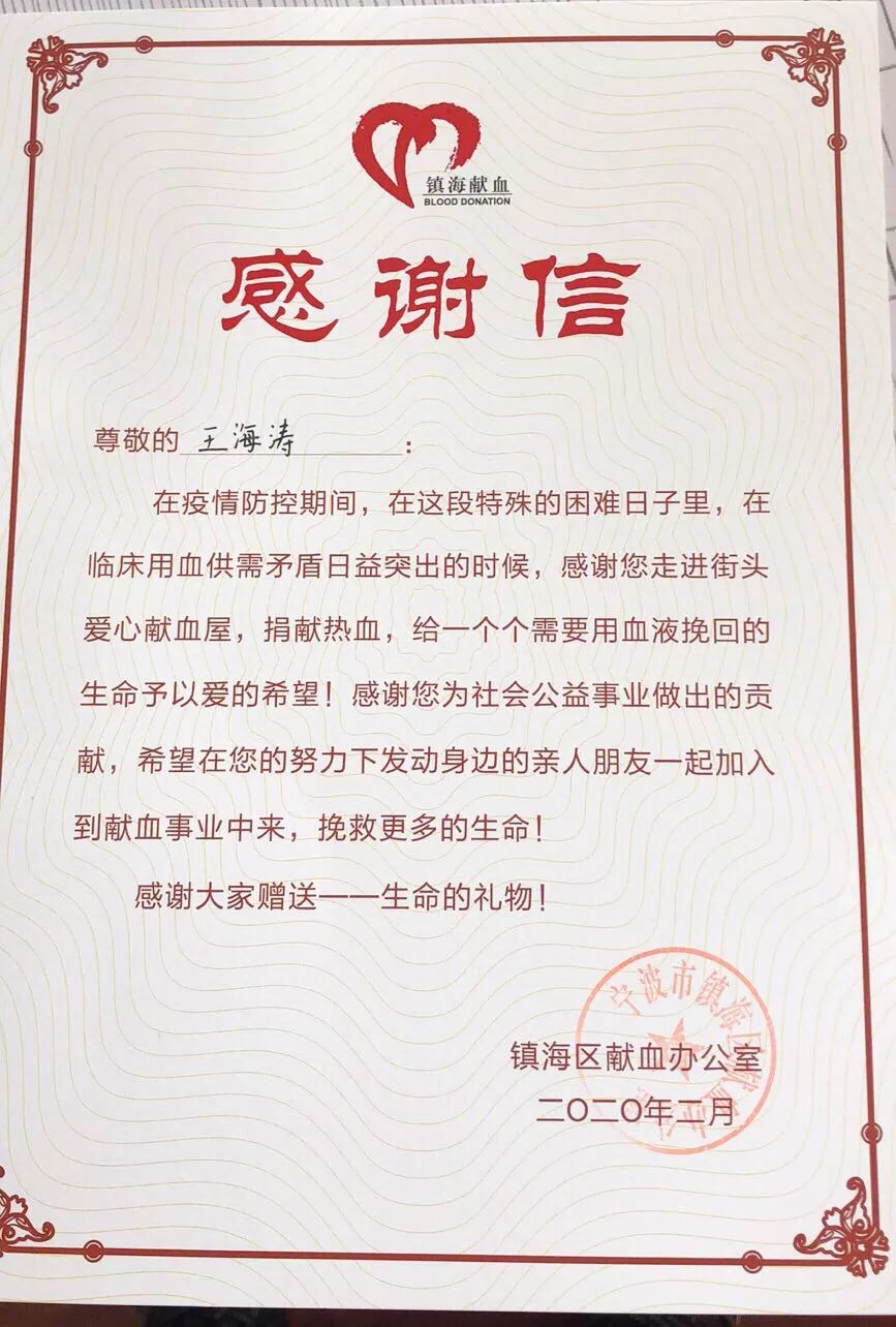 大爱无疆,真爱无价,在全民打响阻击新型冠状病毒感染肺炎疫情战役的关键时期。乐鱼中国官方网站 - 乐鱼leyu(中国)员工王海涛同志接到镇海血库告急,希望他可以前往献血的电话,他作为献血志愿者,在接到电话后毫不犹豫,主动作为,逆行而战。在2月8日,他默默踏上了献血之路,与众多在一线努力的英雄一起守望相助、共克时艰,用自己的方式守护甬城的平安,为缓解镇海在非常时期的用血紧张奉献自己的力量。